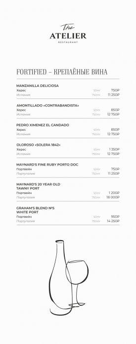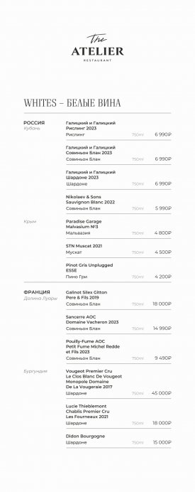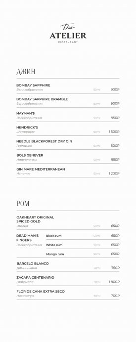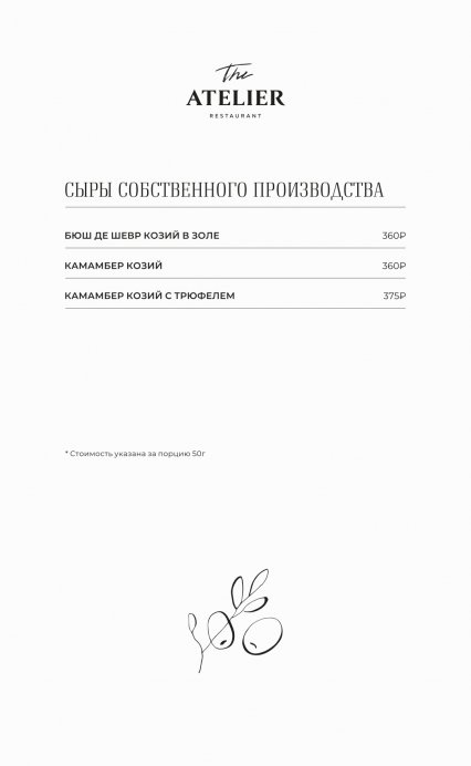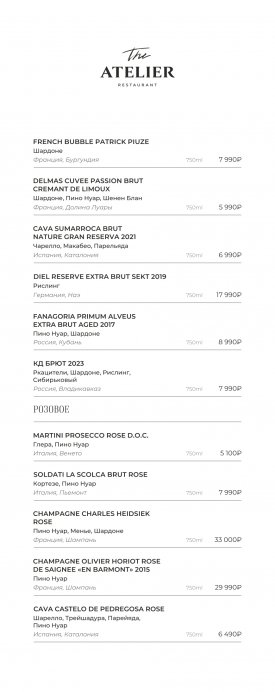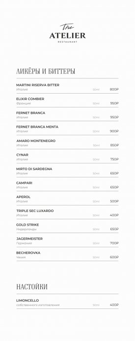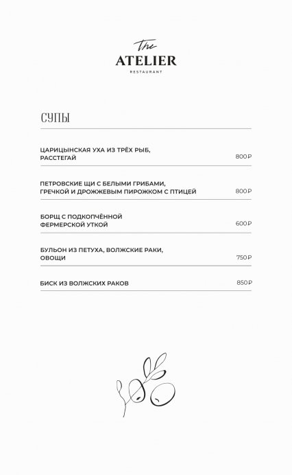 В меню The Atelier собраны блюда русской и европейской кухни. В качестве стартера подают форель гравлакс, тартар из мраморной говядины, грудинку из мангалицы и ростбиф из пиканьи. На первое готовят Царицынскую уху из трех рыб, борщ с подкопченной фермерской уткой и биск из волжских раков. На горячее предлагают стейк из карельской форели с чечевицей, Рибай с томатами и Чимичурри, котлету Марешаль с раковыми шейками и пасту орзо с белыми грибами. В разделе десертов обратите внимание на тарталетку с ванильным ганашем и теплый пирог с миндалем.